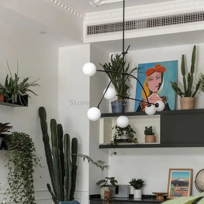 Add a touch of artistic elegance to your space with this modern minimalist line chandelier — a designer lighting piece featuring molecular-style glass balls perfect for stylish homes and creative workspaces.
